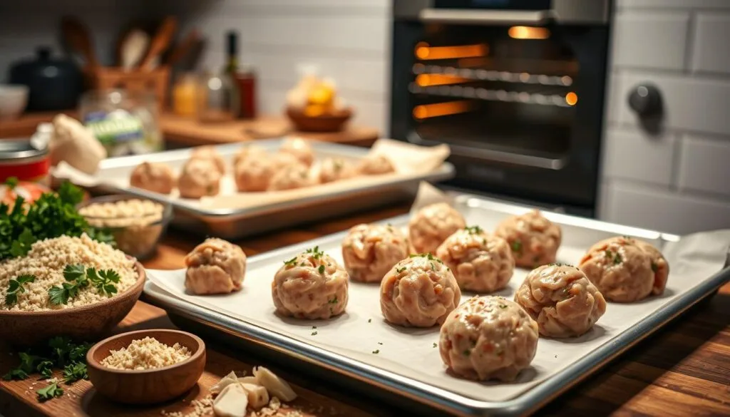 Start by getting all your ingredients ready. Make sure your ground chicken is fresh and the right temperature. Mix your ingredients well to get the right texture for your meatballs.